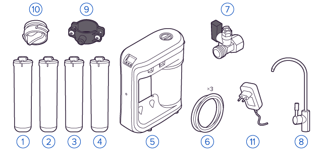 В фильтрах обратного осмоса установлена мембрана, которая не пропускает ничего, кроме воды (вода проходит через неё под давлением). Такой фильтр делает безопасной водопроводную воду любого качества, удаляя все вредные примеси: бактерии, вирусы, хлор, тяжелые металлы, нитраты, фармацевтику. Обратноосмотические фильтры используются для абсолютной защиты от накипи, т.к. полностью устраняют соли жесткости из воды. |